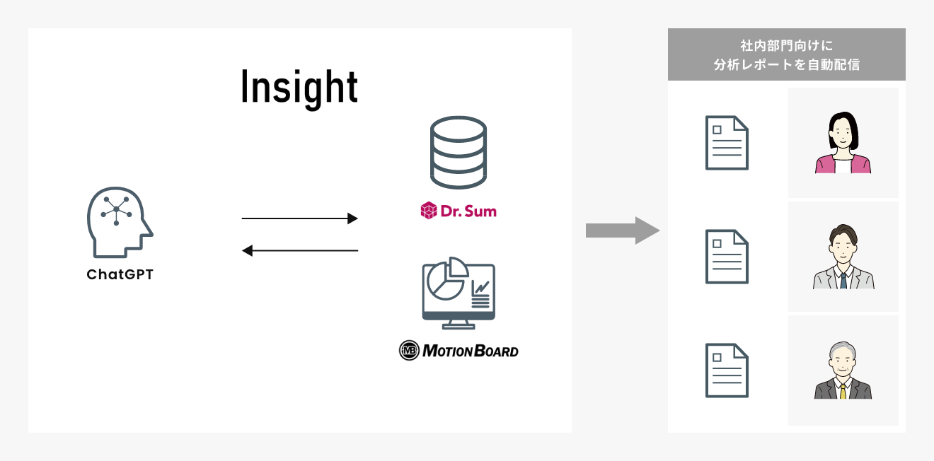 「Dr.Sum」上に格納した経営データに対して数値解析・ChatGPTによる示唆・傾向分析を実施、「MotionBoard」より分析結果に基づく社内部門向けレポートを自動配信する仕組み「Insight」の運用を開始。