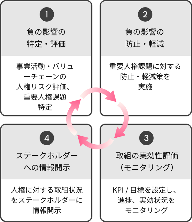 当社は、グループの人権方針に掲げるとおり、国連の「ビジネスと人権に関する指導原則」に基づき人権尊重に取り組んでおり、そのために以下の人権デュー・ディリジェンスを実施しています。